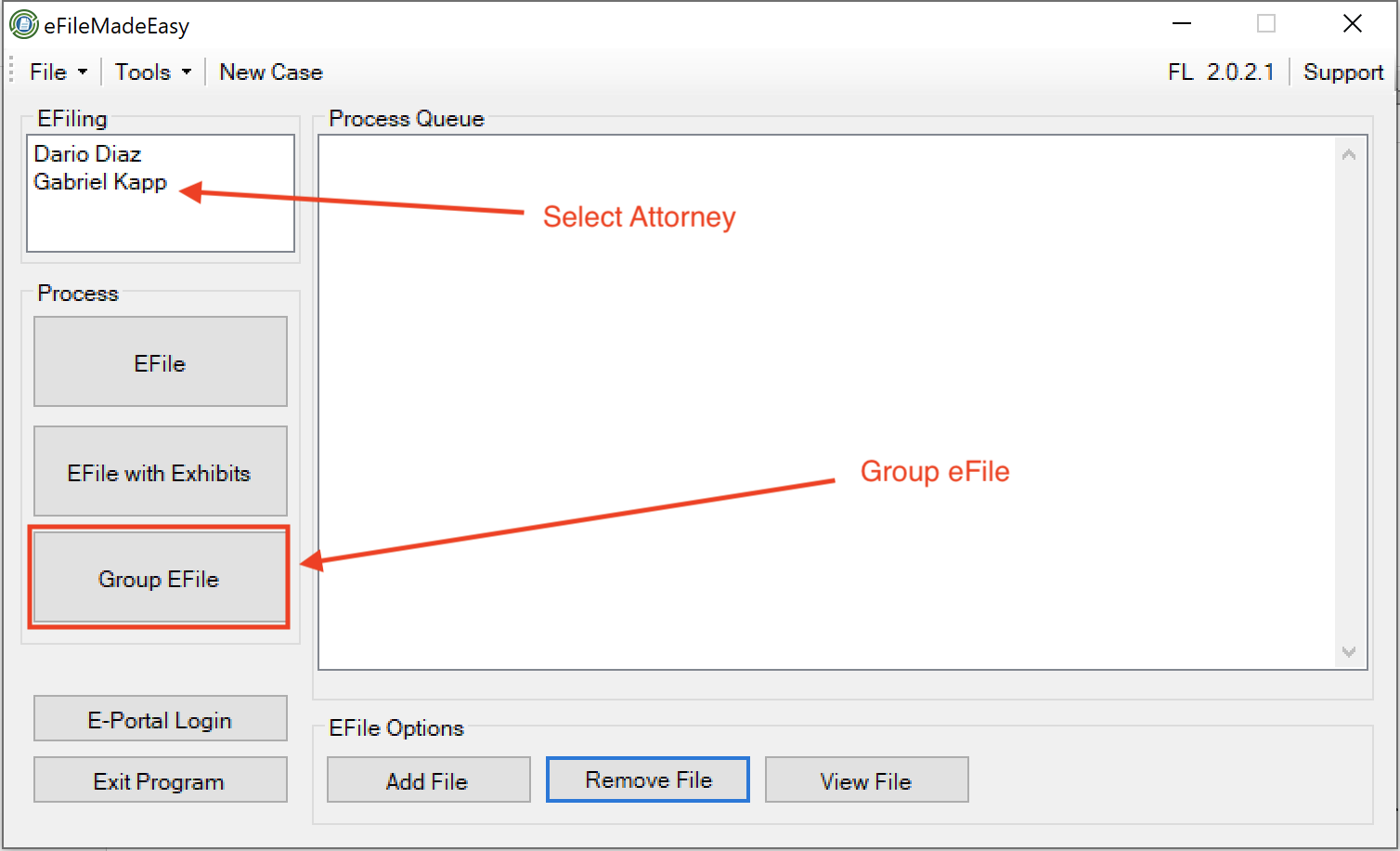Selecting the eFileMadeEasy option will open the eFile Software. You will notice that the file is listed in the "Process Queue" and is shown as a PDF file. The file is ready to be eFiled with the portal and eServed to your service list. At this point, if you have multiple attorneys who are listed in the user window just select which attorney is filing the document, and click the Group EFile button. See Figure 2.
