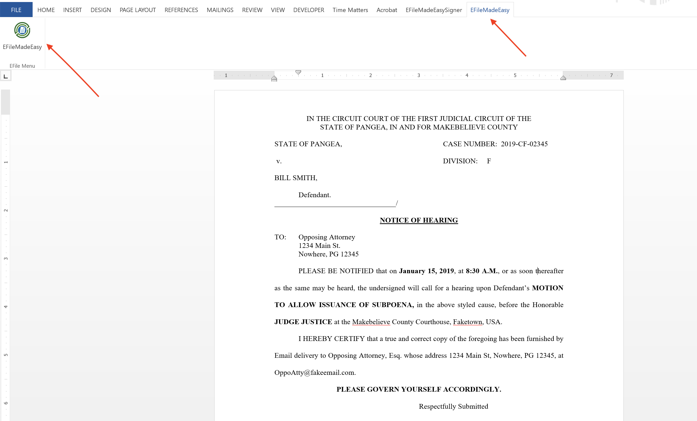Figure 1 shows the Microsoft Word document window with a sample document ready to be efiled. The top menu will show the eFileMadeEasy menu item and the eFileMadeEasy button. Selecting the eFileMadeEasy button will perform the following functions on the Word document:
