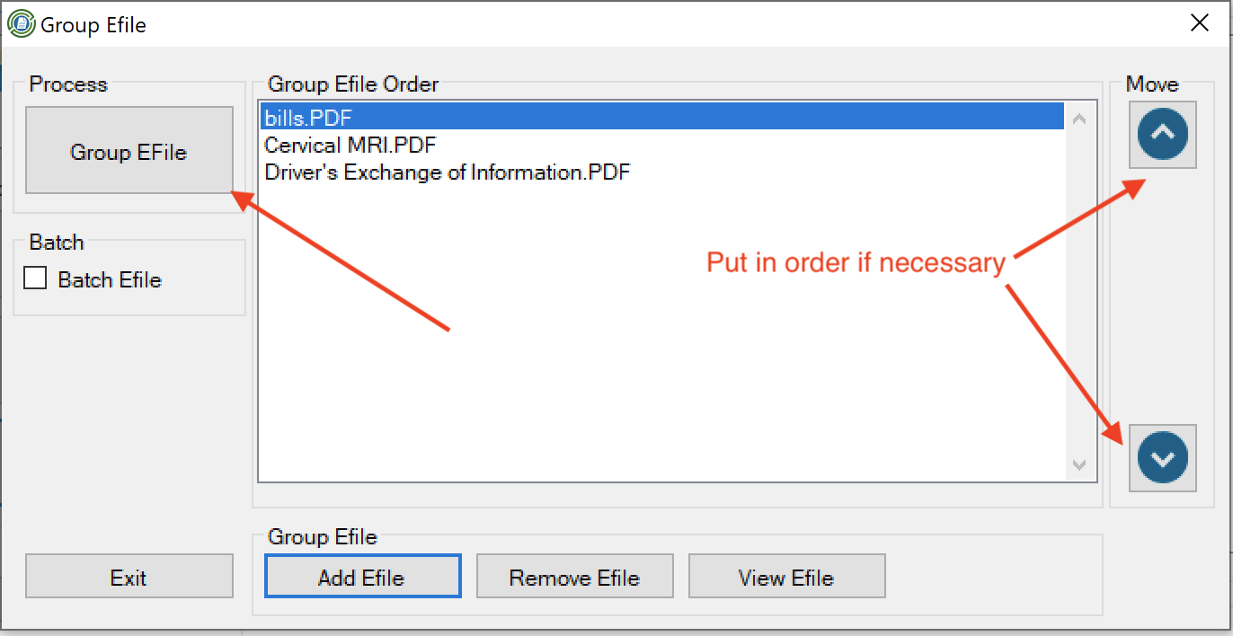 When you have all of your documents input and ordered hit the Group Efile button.
